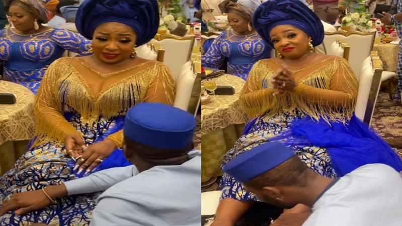 In the video taken at Iyabo Ojo’s mother’s one-year remembrance, Anita is seen sitting on a chair while her husband, better known as MC Fish, is seen bending to massage her feet.