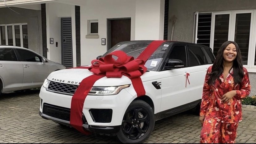 The former Big Brother Naija reality star is seen posing with the white Range Rover that still has red ribbons on it.