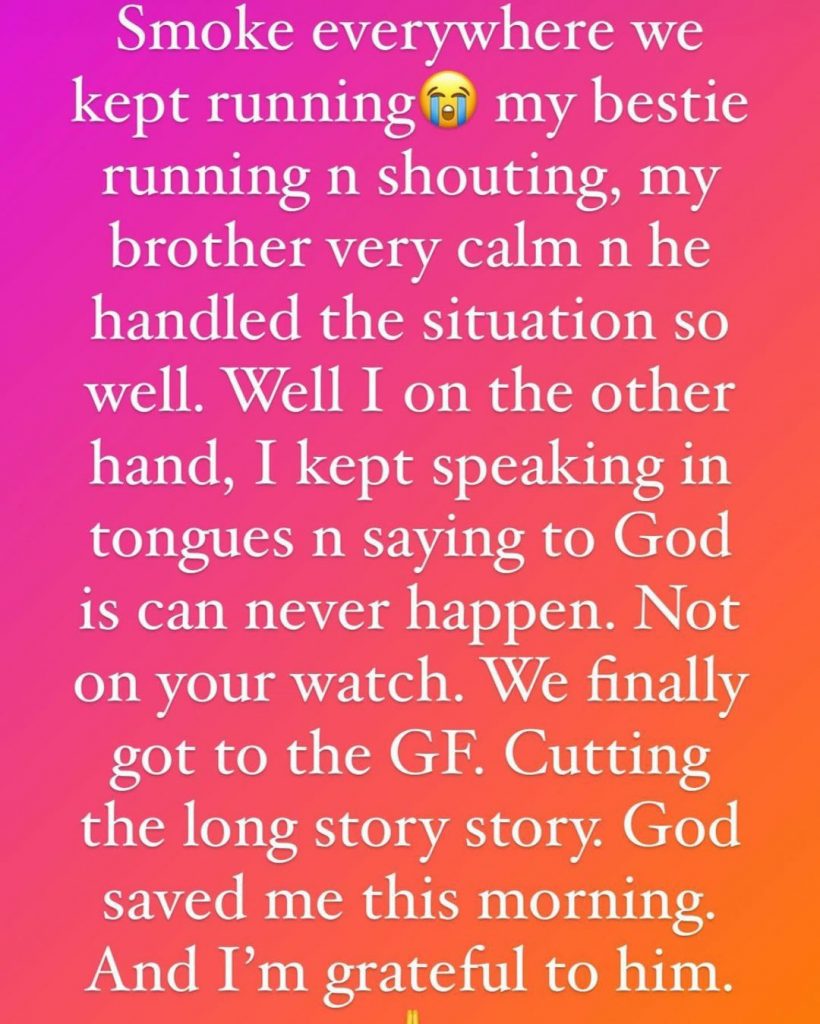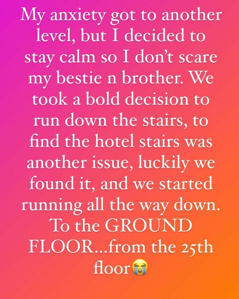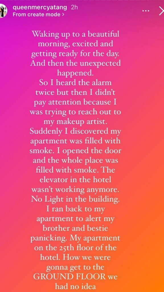 She further stated that in a twinkle of an eye, her apartment, located on the 25th floor was filled with smoke. And when she made to run out for safety, the hotel elevator was no longer working, meaning she and other occupants had to use the staircase to get to the ground floor.