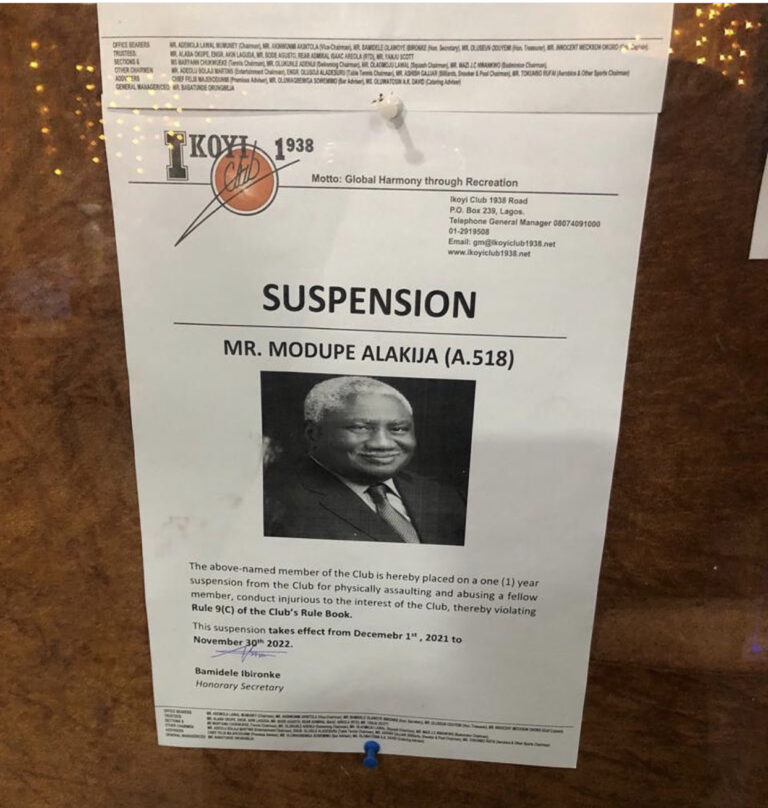 Modupe Alakija, husband of oil mogul, Folorunsho Alakija, has been punished by upscale social club, Ikoyi Club, which he is a member of, for getting physically violent with another prominent member of the club.