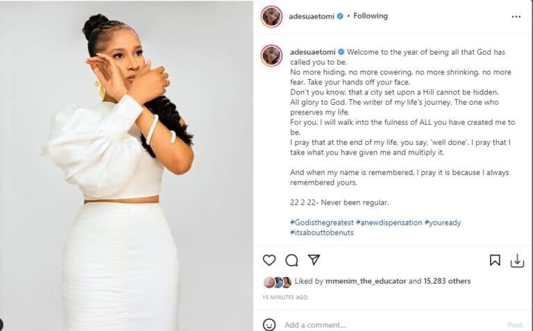 While expressing appreciation to God, Adesua Etomi acknowledged all His promises over her life and vowed to walk in God’s path and multiply all her gifts.