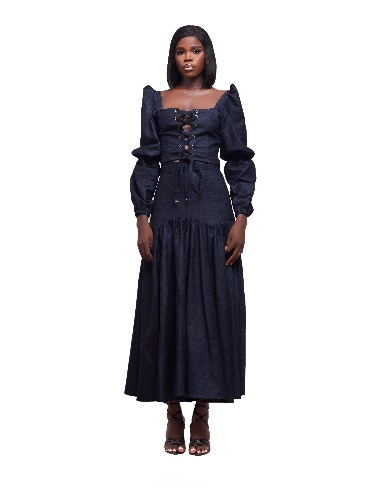 The next piece in the collection is a dress that feels like a tale from a different time, but with a present feel. It features romantic sleeves, a corset lace-up, and a full skirt, bringing drama without losing grace.