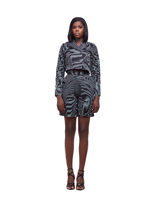 The last piece in this collection is a well-tailored playsuit. It features a cropped jacket and high-waisted shorts that give boardroom energy.