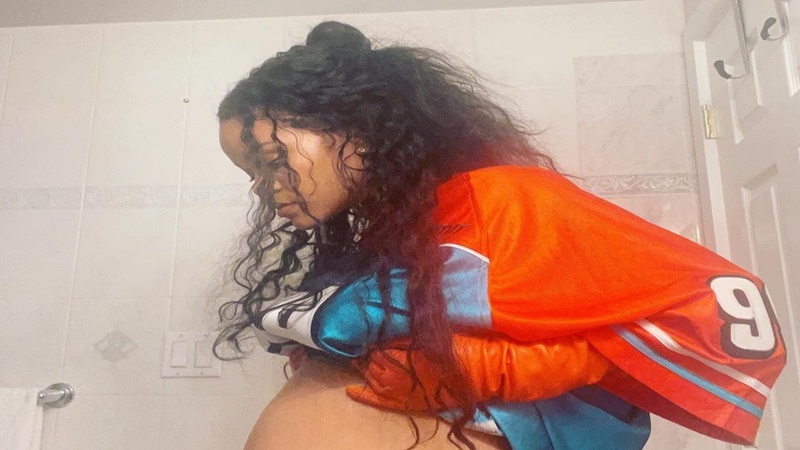 The 33 years old hitmaker raised her top to take a photo of her growing belly from the side.