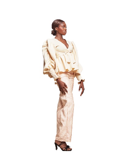 The next outfit in the collection is a two-piece set. These designs’ tops and pants are cut from different fabrics that flow seamlessly. The top features the very popular V-neckline, which runs down a bit, revealing cleavage. This simple design cut enhances femininity, giving it a stylish appearance.