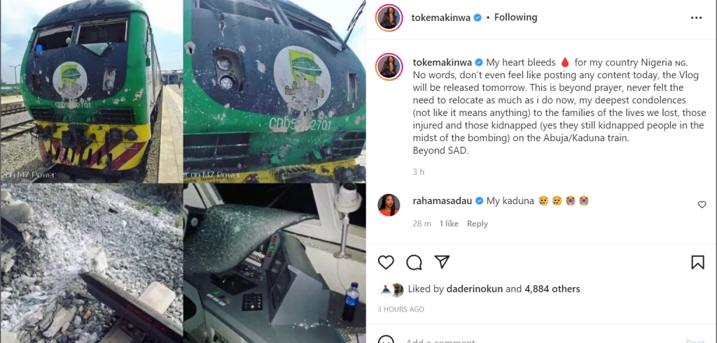 Media personality, Toke Makinwa, has reacted to the recent Kaduna-Abuja train attack which left many dead, injured and others, kidnapped.