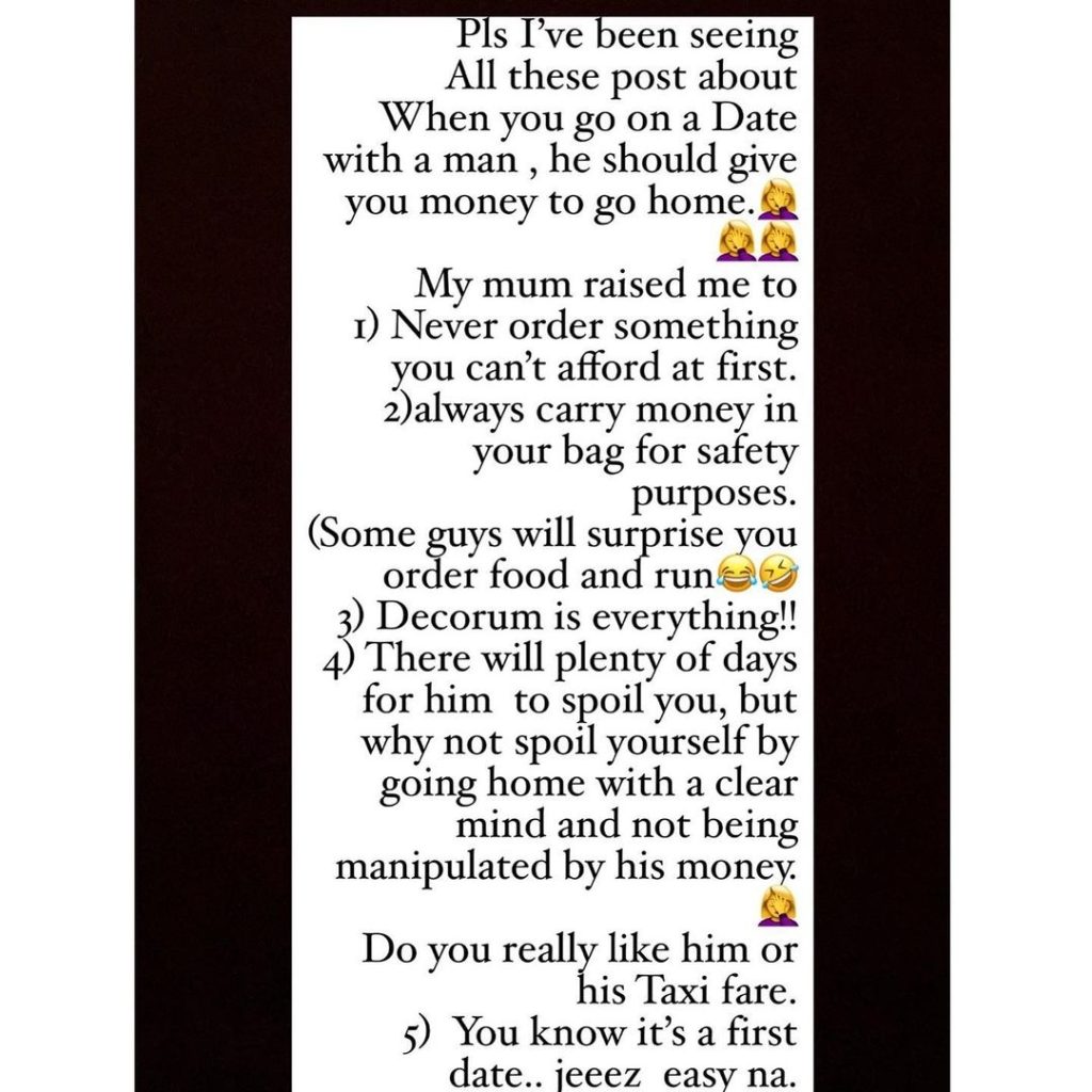 In a cryptic message on Instagram, the 34-year-old revealed that her mother taught her never to order for what she cannot afford, always carry money along in her bag for safety.