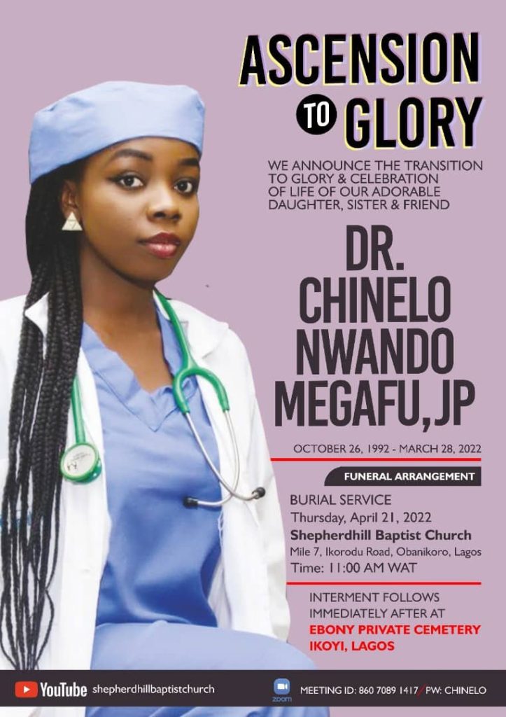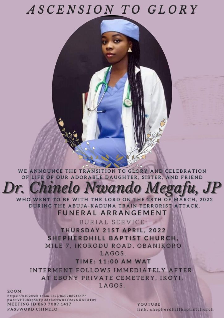 The family of 29-year-old Doctor, Chinelo Nwando Megafu, who was killed in the Abuja-Kaduna train attack on March 28 has announced her funeral arrangement.