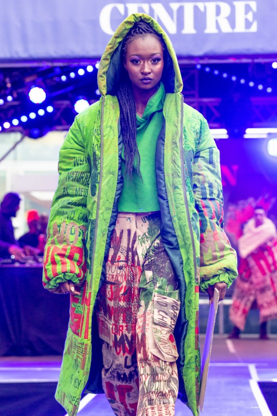 Continuing in AFWL’s resolve to promoting and uplifting design graduates of colour, the show started with three mini-collections from the Universities of Northampton and West London. Themes of protest were evident in both universities’ collections. Black Lives Matter and awareness of misogynoir ; the unique discrimination faced by black women, also featured in powerful graphic print.