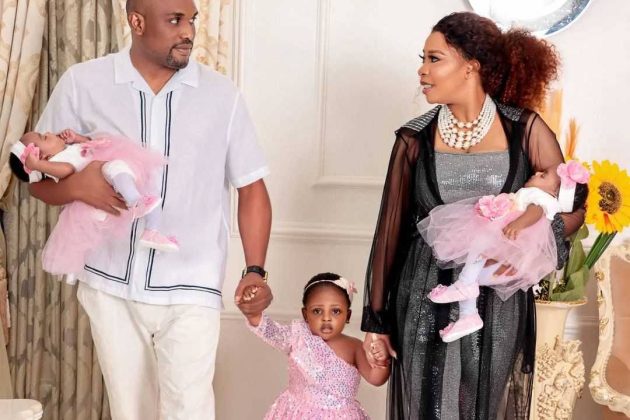 She expressed gratitude to God for giving her twin daughters, Isabella and Christabel, with a shared photo of her family, showing herself holding the twins and her husband holding her first child.