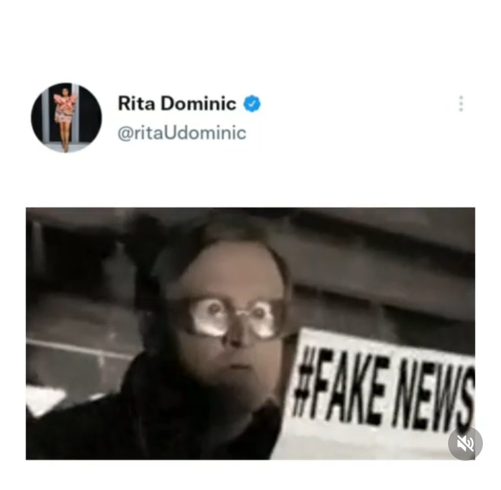 However, reacting to this report, Rita Dominic shared a cryptic message on her verified Twitter platform, indicating that the wide spread information is nothing but fake news.