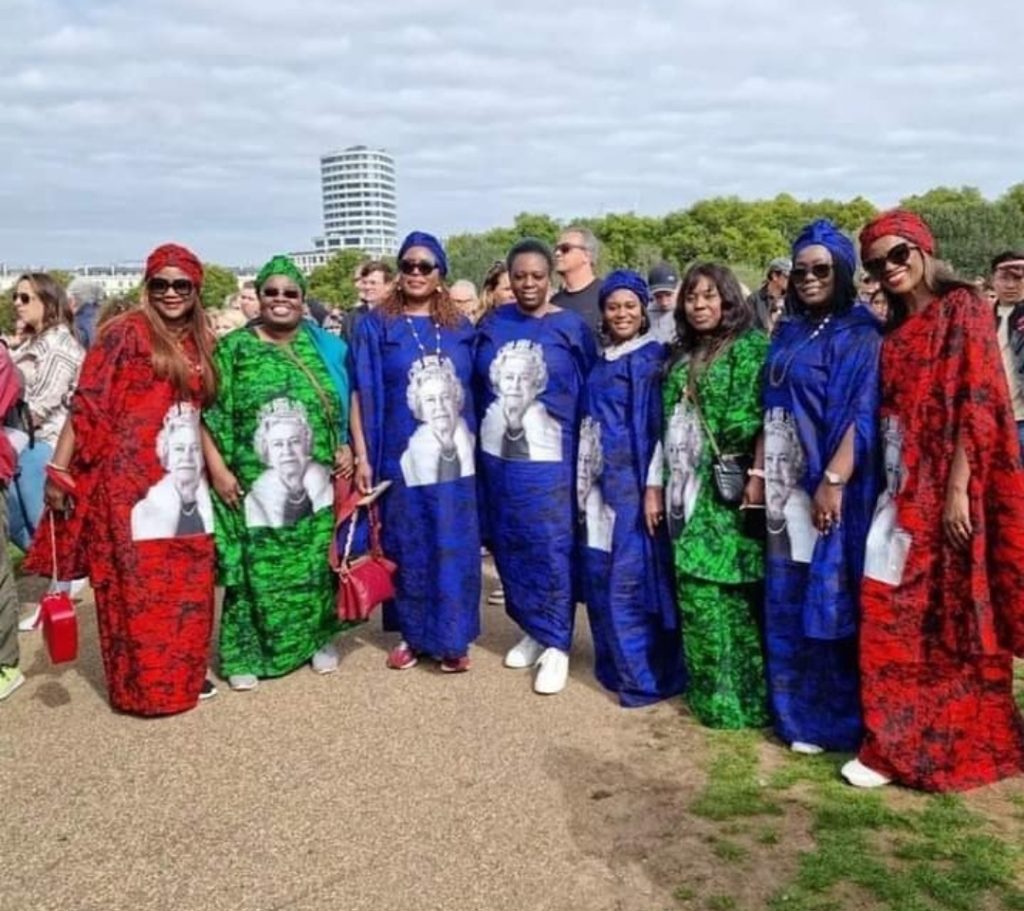 The ladies, who were among those present on the streets and around the historic Westminster Abbey, the venue of the funeral wore the ankara fabric with the Queen’s face embroidered on them, as a means of honouring the longest reigning monarch in their own special way.