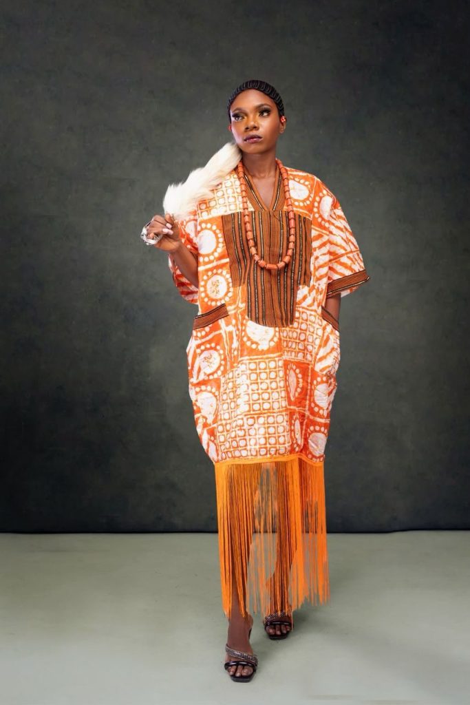 The first look advancing like a procession is a loose kaftan, cut from hand patterned adire fabric in sun bright orange, resisting white in circles, grids, and leaf silhouettes, falling into a waterfall of tangerine fringe that brushes from the kneel to the ankles.