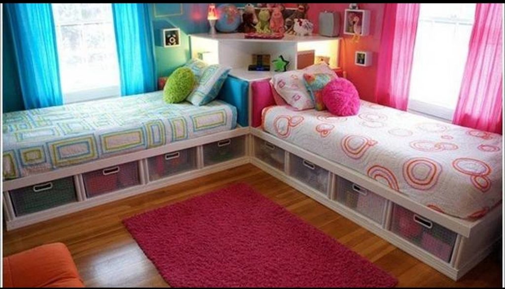 If the bedroom is big enough, consider designating a “play” area and a “sleep” area. The play area could include a toy chest and even a chair or small loveseat. This arrangement can help bring the kids together but also, gives them space away from each other when needed.