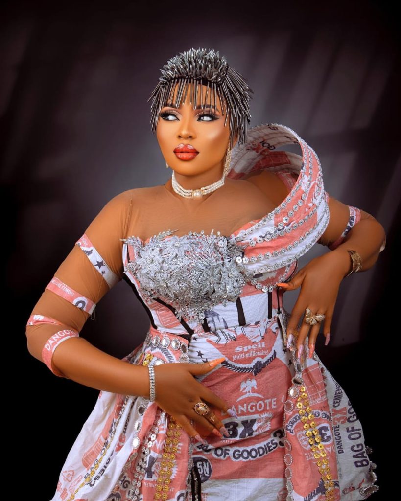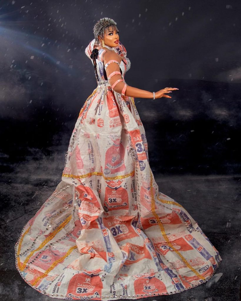 The 2019 Big Brother Naija reality TV star shared photos from her birthday shoot, wearing a beautifully designed dress made entirely from cement bags on her Instagram page.