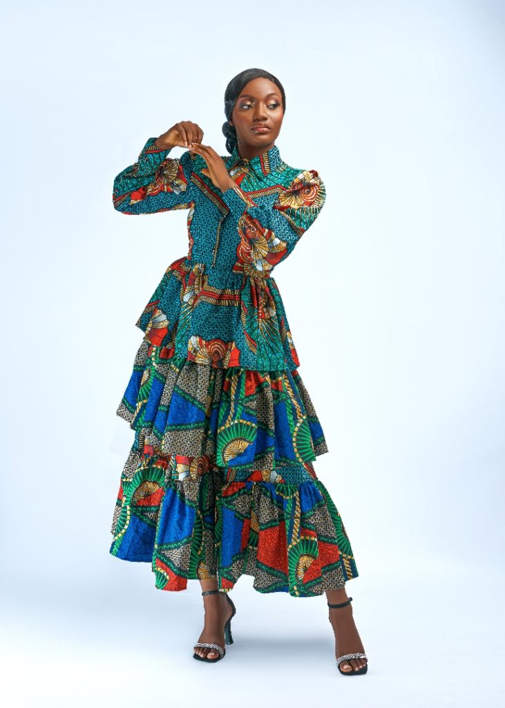 The bold and bright colours utilised in conjunction with the Ankara prints capture Africa’s lively and colourful essence. The collection prominently features green, purple, and turquoise blue, each colour chosen deliberately to convey a sense of calmness, energy, sophistication, creativity, tranquillity, and freshness that resonates throughout these designs.