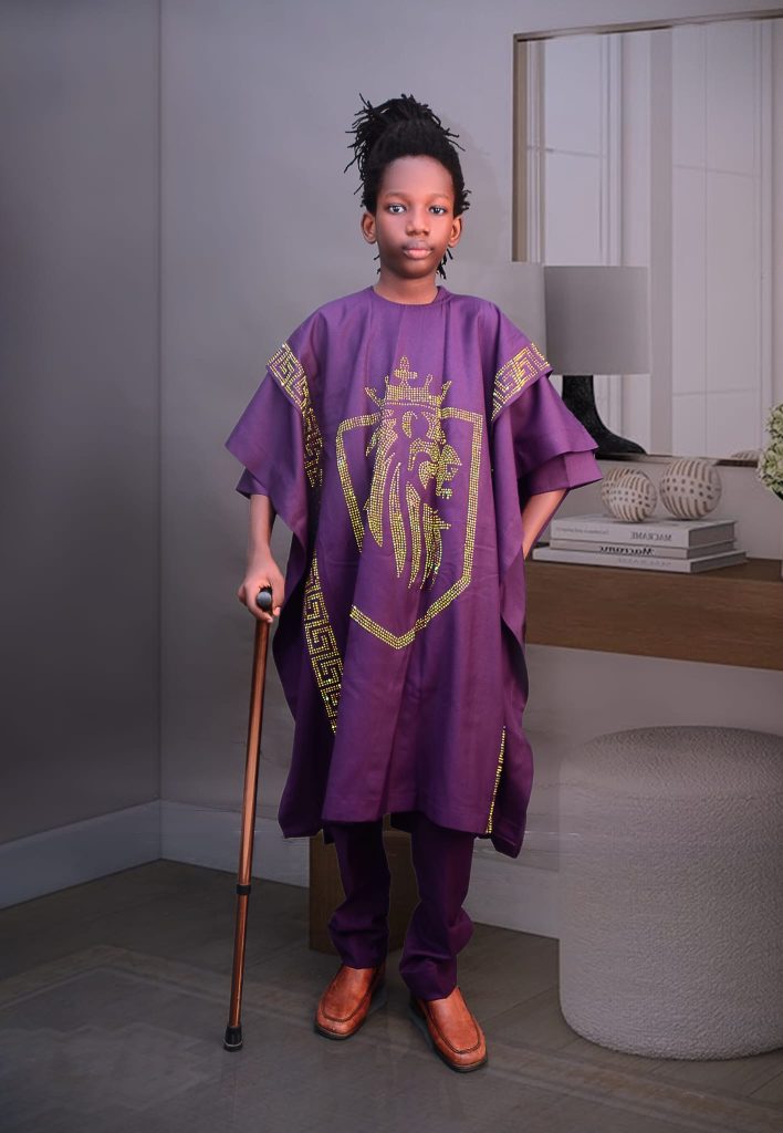 The opening piece was striking. A boy walked into the space wearing a purple agbada that carried itself like royalty. The fabric had weight, but it moved gracefully as he stepped. Across the chest, a lion’s head appeared in golden embroidery, shining under the lights as though it had been carved into the garment.