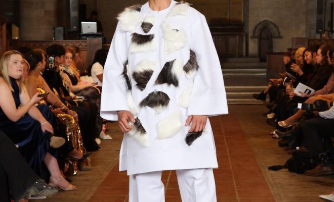 Finally, a men’s two piece in pale ivory yellow appeared. The tailoring was clean, relaxed, and elegant. The colour was subtle, but the fabric glowed faintly under the light, giving the outfit an understated richness. The detailing at the neckline and pocket offered a touch of character without stealing attention from the simplicity of the design. It was the most modern piece of the collection, proof that heritage can also find its voice in restraint and subtlety.