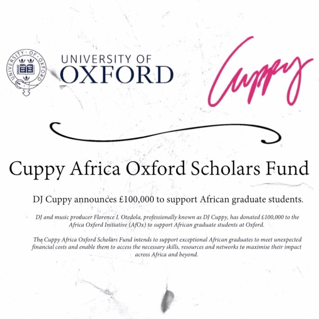 Celebrity disk jockey, Florence Otedola, popularly known as DJ Cuppy has announced the creation of a £100,000 scholarship fund to support African graduate students pursuing their studies at the University of Oxford.