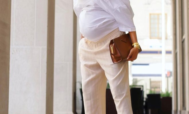 In one photo, the couple is standing next to one another smiling while in other pictures she is seen cradling her baby bump.