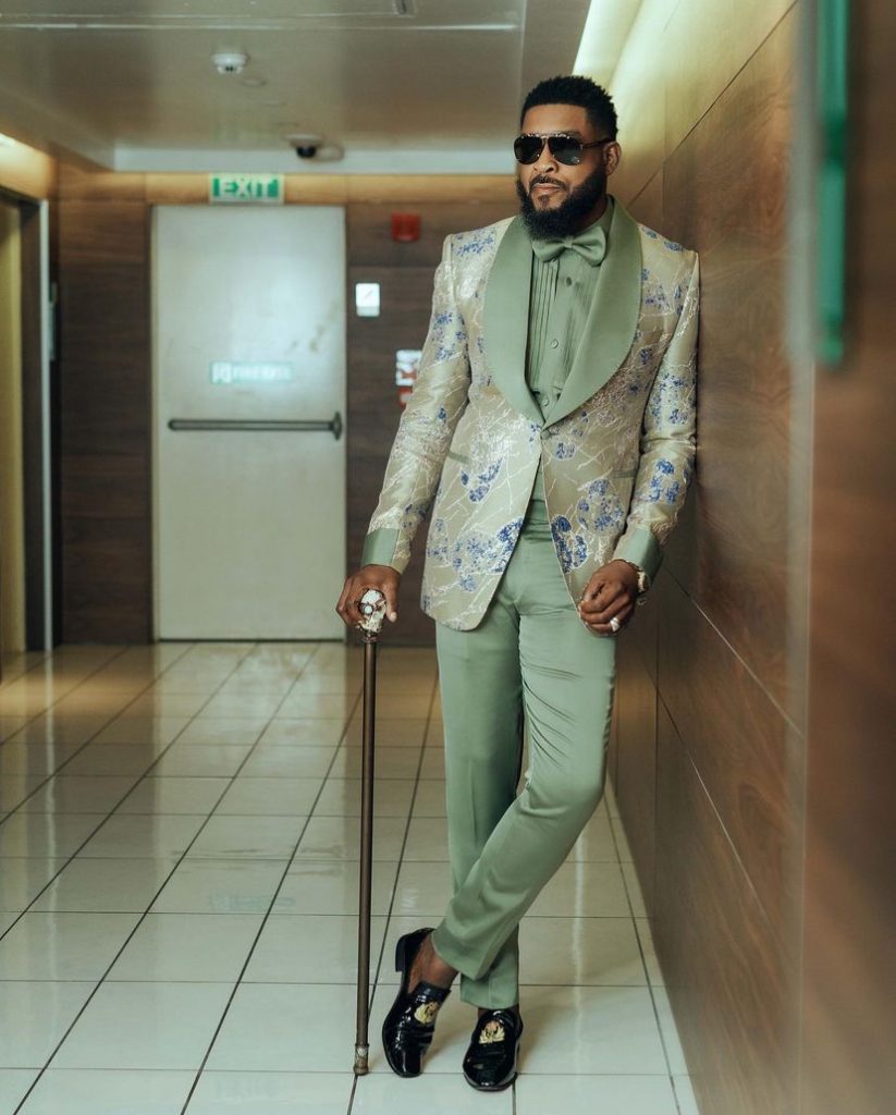 “Shantytown” star, Chidi Mokeme, attended the 2023 Africa Magic Viewers Choice Awards in May, reaffirming his nickname ‘GQ’ in an embroidered sage Jax Grehman bespoke tuxedo. The slim-fit look styled with a crisp pleated shirt and bow tie of the same hue was finished-up with a pair of black loafers and a statement walking cane.