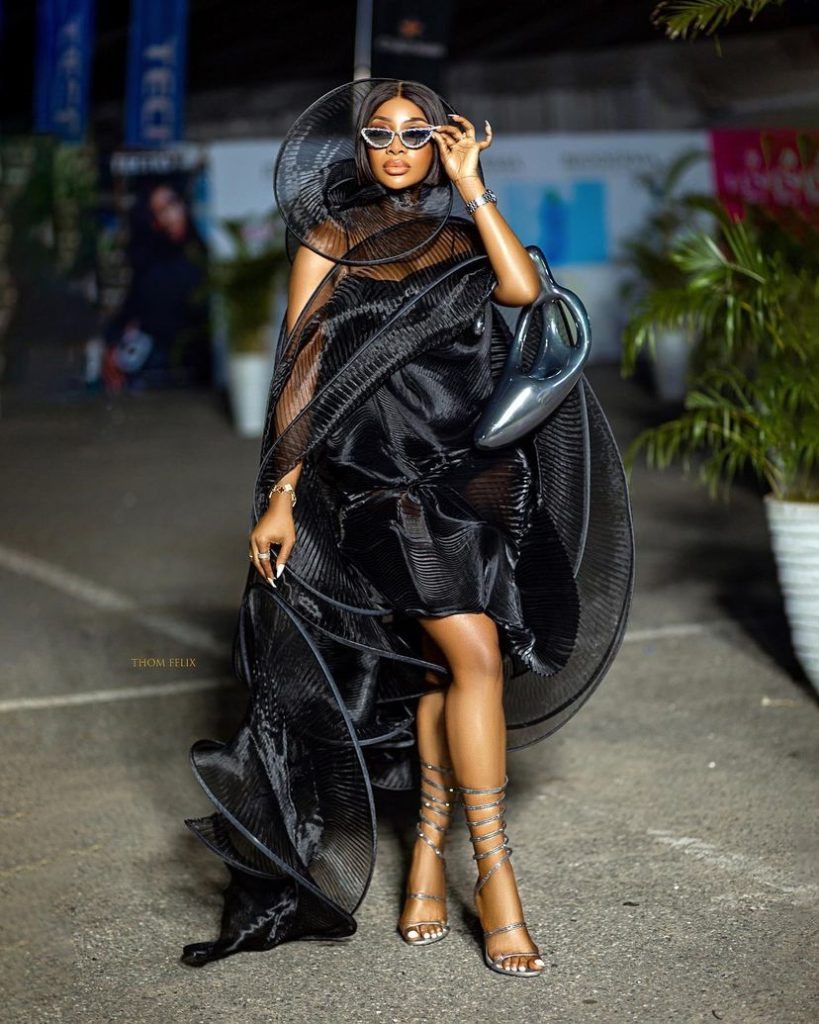 In another chic nod to the sculptural outfit trend, Chioma Ikokwu, aka Goodhair, looked fabulous attending the 2023 Lagos Fashion Week in this artistic all-black dress designed by LFJ. Her artistic clutch bag and statement sunglasses really put a finishing seal on the look.