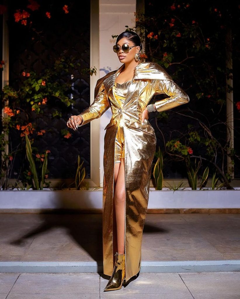 Exactly two weeks ago, she made a golden statement in this metallic number. Kiekie complemented the Accost Collection two-piece outfit with a pair of matching ankle-boots and large stud earrings.