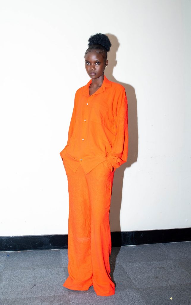 As the models continued down the runway, the collection revealed its versatility and depth. One of my personal favorites was the orange long sleeve shirt and pants set.