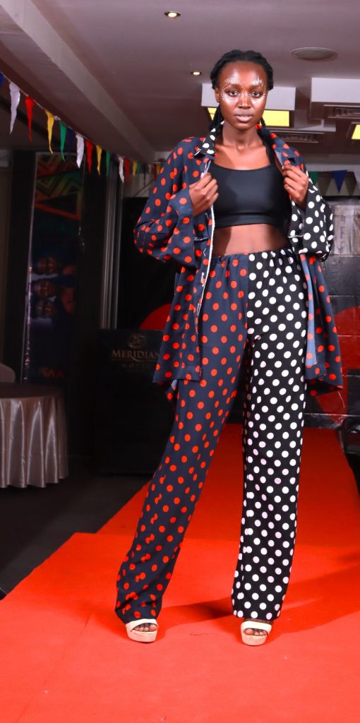 The show opened with an electrifying two-piece shirt and trouser set that immediately caught my attention. This wasn’t just any outfit—it was a daring statement piece that set the tone for the entire collection. On one side, the shirt and trousers were crafted from a rich dark blue fabric, punctuated with vibrant red polka dots.