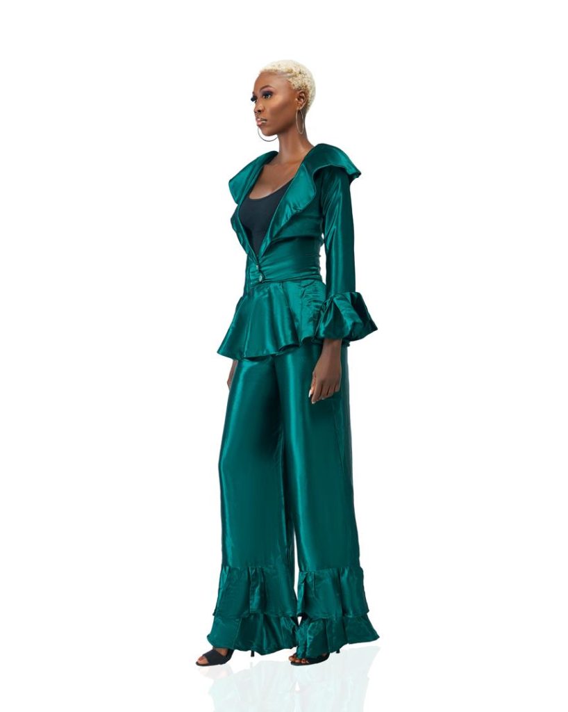 The flares present in the jacket and the pants enhance the overall silhouette, adding a layer of sophistication that complements the collection’s timeless appeal without negatively impacting the simplicity of the attire. This careful balance of comfort and uniqueness reflects Atinuke’s dedication to creating fashion that is both timeless and gracefully distinctive, while also channelling a subtle hint of vintage charm.