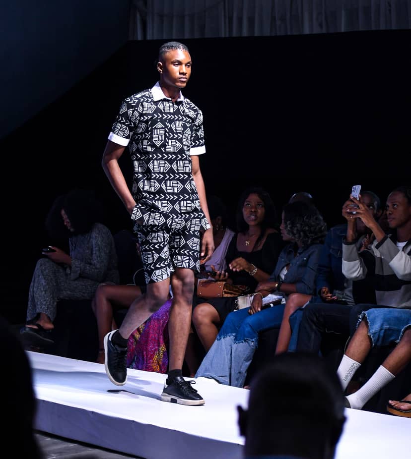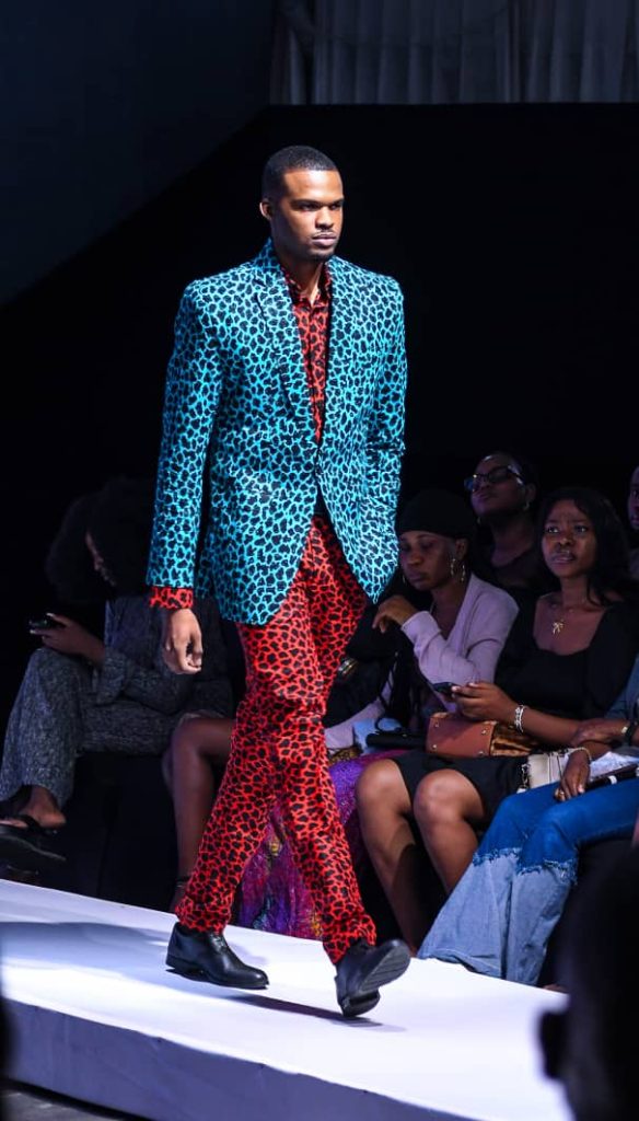 The collection has quite some zip-up jackets and shorts made from the traditional Yoruba textile, Adire fabric, sewn into street-style fashion. The jackets in the collection are sewn in a style that men and women can explore both in the dry (summer) and wet (winter) seasons of the year, highlighting the versatility and timeless appeal of Adire fabrics. Equally captivating was a three-piece suit that mixes bold animal prints in turquoise and red and is sewn with Ankara fabric, which can be worn to formal events. It was a daring look as the model strutted down the runway, captivating the attention of all attendees. This suit was not just a fashion statement; it was a declaration of Tunde’s creativity and technical skills.