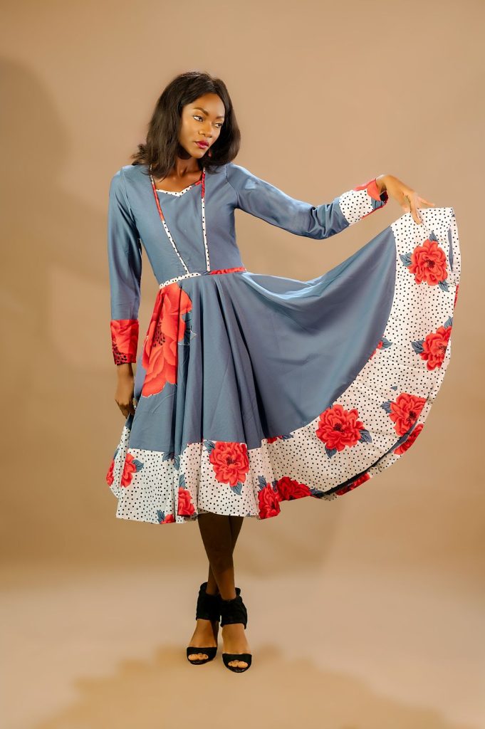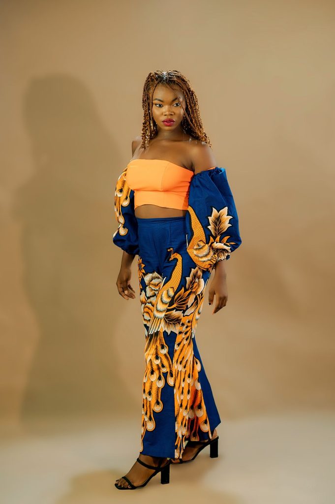 “Elegant Aura” also explores a rich palette of colours, including black, blue, orange, white, and red. Each hue is chosen to evoke different emotions and complement the intricate patterns of the Ankara fabric. The use of these bold colours highlights the collection’s dynamic and versatile nature, allowing each piece to make a unique statement.