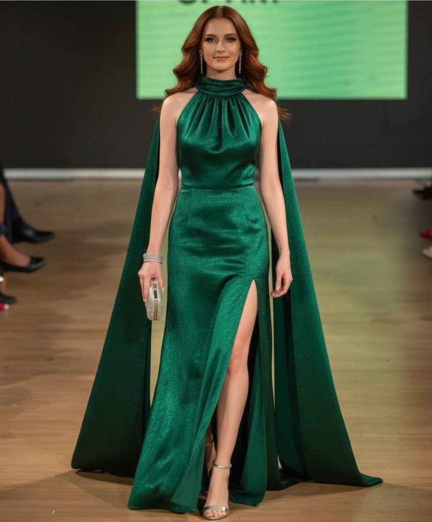 Then came the standout piece, a floor-length emerald gown with a high ruched neckline and cape-like panels that draped from the shoulders to the floor. It commanded the runway with quiet strength. The thigh-high slit gave it a contemporary edge, while the richness of the green felt regal, cinematic even. It was the sort of dress that could easily migrate from the AFWN stage to an international red carpet, a clear marker of Glowtarz’s potential reach.