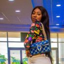 The silhouette flows from a cinched waist defined by a structured sash belt into wide-leg trousers that communicate both power and elegance. With golden statement earrings and a sleek braided ponytail, the look is polished to perfection.