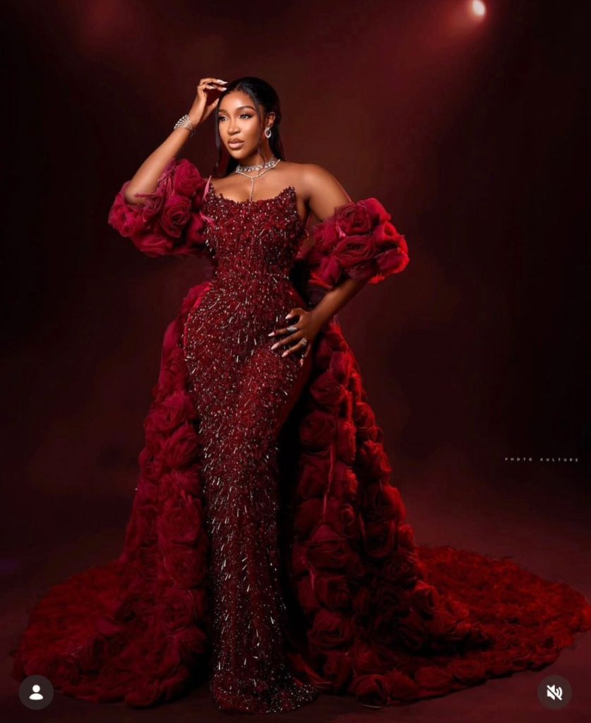 The technical prowess displayed in Edolo is nothing short of sculptural. Ehizuenlen moves beyond simple tailoring into the realm of corporeal architecture. The standout technique is her “sculpted drapery”, the use of heavy, lustrous velvets manipulated to hold rigid, scepter-like lines while simultaneously flowing into oceans of tulle.