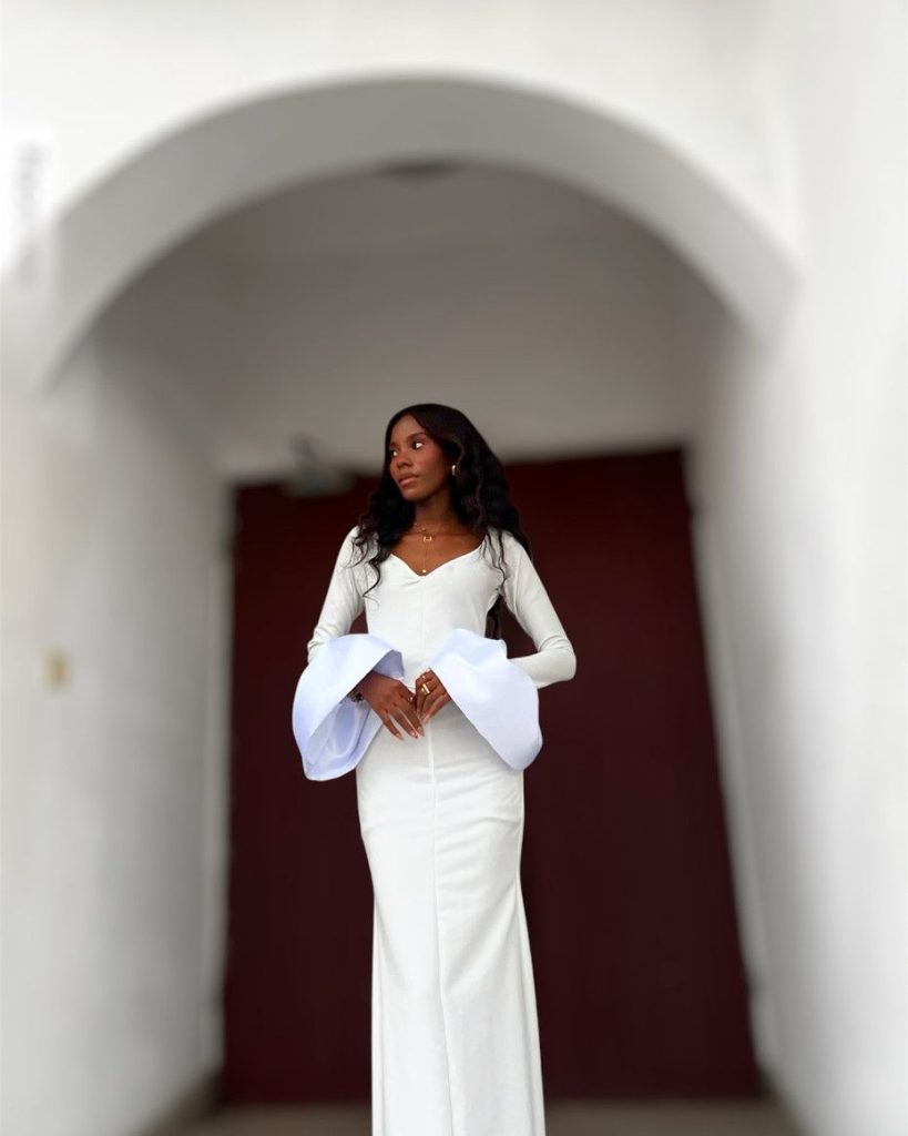One of the standout pieces in the collection is the pristine white long-sleeved gown. It’s clean, column-like structure allows the exaggerated flared sleeves to take center stage, mimicking the gentle unfolding of petals. The neckline, a modest sweetheart curve, reveals the collarbone in a manner that is both graceful and modestly seductive. The gown makes a compelling argument for restraint in design, letting form and silhouette become the focal point. It’s a piece that feels ceremonious yet wearable, and its success lies in the seamless integration of drama and simplicity. The sleeves, while sculptural, never overtake the figure. Instead, they accentuate movement, functioning like an extension of the wearer’s expression.