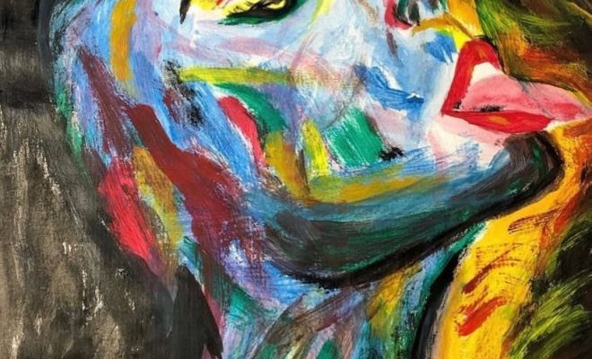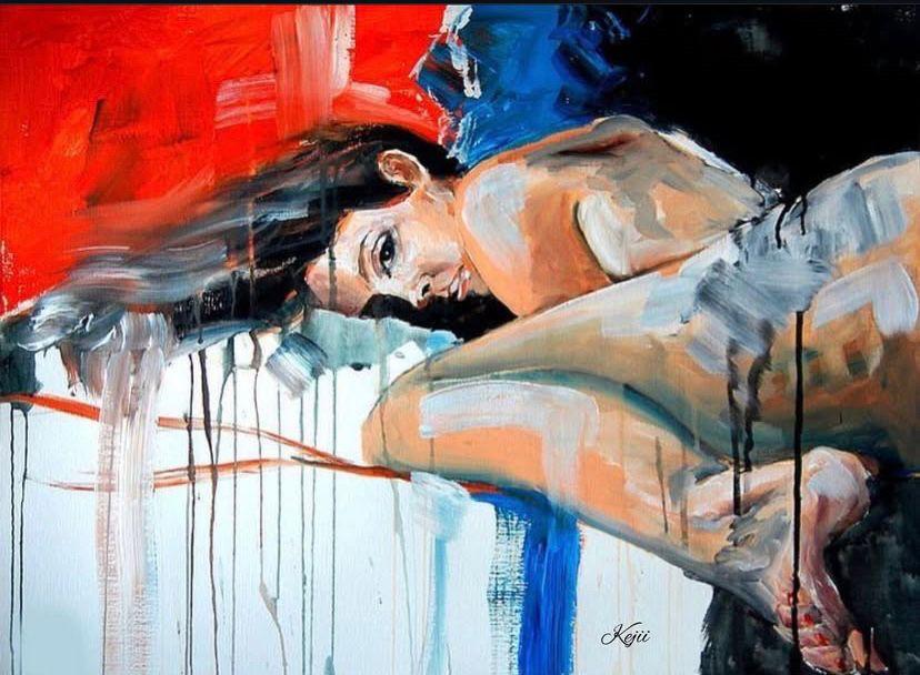 The first canvas I saw was of a woman lying down, her body curled in slightly but her eyes wide open. The background was a storm of colour—thick strokes of red bleeding into streaks of blue and white. Some areas looked like they had been scraped away, others layered on thickly.
