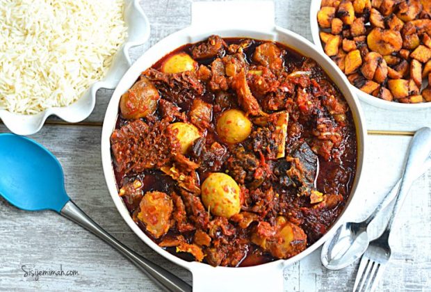 Joy Onuorah Ingredients 6 Red Bell Peppers (Tatashe) Assorted meats (Boiled and Fried) 4-6 Boiled Eggs (Optional) 1.5 cups Palm oil 2 Big onions 2-4 Scotch ...